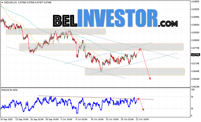NZD/USD прогноз Форекс и аналитика на 23 октября 2025 предполагает попытку теста области сопротивления вблизи уровня 0.5765. Откуда стоит ожидать продолжения падения котировок в область ниже уровня 0.5665. Дополнительным сигналом в пользу снижения выступит отбой от линии сопротивления на индикаторе относительной силы. Отменой варианта падения пары NZD/USD станет сильный рост цены и пробой уровня 0.5805. В этом случае стоит ожидать продолжение подъёма пары с потенциальной целью выше уровня 0.5945.
