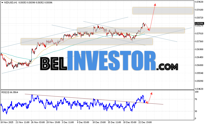NZD/USD прогноз Форекс и аналитика на 24 декабря 2025 предполагает попытку теста области поддержки вблизи уровня 0.5795. Откуда стоит ожидать продолжения роста котировок в область выше уровня 0.5945. Дополнительным сигналом в пользу подъёма выступит отбой от линии поддержки на индикаторе относительной силы. Отменой варианта роста пары NZD/USD станет падение цены и пробой уровня 0.5705. В этом случае стоит ожидать продолжение снижения пары с потенциальной целью ниже уровня 0.5525.