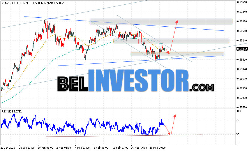 NZD/USD прогноз Форекс и аналитика на 24 февраля 2026 предполагает попытку теста области поддержки вблизи уровня 0.5965. Откуда стоит ожидать продолжения роста котировок в область выше уровня 0.6085. Дополнительным сигналом в пользу подъёма выступит отбой от линии поддержки на индикаторе относительной силы. Отменой варианта роста пары NZD/USD станет падение цены и пробой уровня 0.5905. В этом случае стоит ожидать продолжение падения пары с потенциальной целью ниже уровня 0.5745.