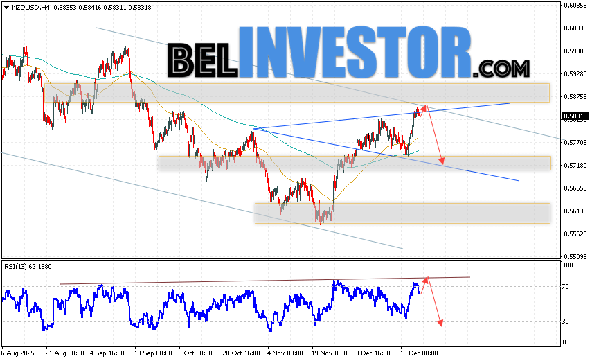 NZD/USD прогноз Форекс и аналитика на 26 декабря 2025 предполагает попытку теста области сопротивления вблизи уровня 0.5865. Откуда стоит ожидать продолжения падения котировок в область ниже уровня 0.5725. Дополнительным сигналом в пользу снижения выступит отбой от линии сопротивления на индикаторе относительной силы. Отменой варианта падения пары NZD/USD станет сильный рост цены и пробой уровня 0.5885. В этом случае стоит ожидать продолжение подъёма пары с потенциальной целью выше уровня 0.5995.