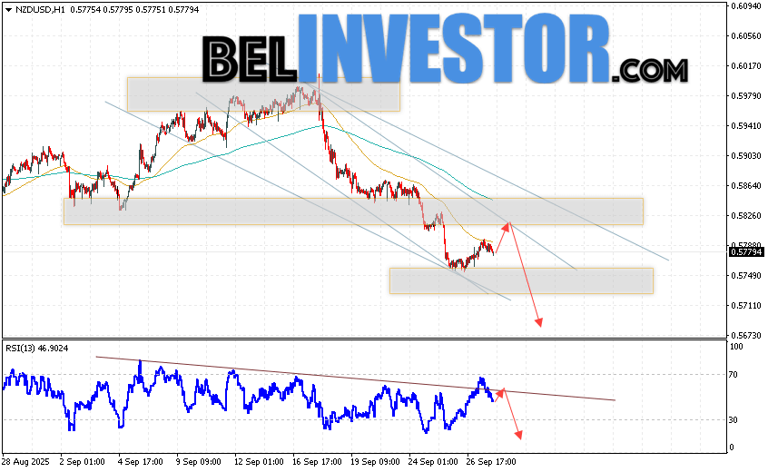 NZD/USD прогноз Форекс и аналитика на 30 сентября 2025 предполагает попытку теста области сопротивления вблизи уровня 0.5810. Откуда стоит ожидать продолжения падения котировок в область ниже уровня 0.5685. Дополнительным сигналом в пользу снижения выступит отбой от линии сопротивления на индикаторе относительной силы. Отменой варианта падения пары NZD/USD станет сильный рост цены и пробой уровня 0.5845. В этом случае стоит ожидать продолжение подъёма пары с потенциальной целью выше уровня 0.6125.