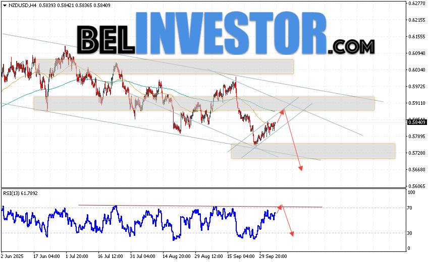 NZD/USD прогноз Форекс и аналитика на 7 октября 2025 предполагает попытку теста области сопротивления вблизи уровня 0.5865. Откуда стоит ожидать продолжения падения котировок в область ниже уровня 0.5675. Дополнительным сигналом в пользу снижения выступит отбой от линии сопротивления на индикаторе относительной силы. Отменой варианта падения пары NZD/USD станет сильный рост цены и пробой уровня 0.5965. В этом случае стоит ожидать продолжение подъёма пары с потенциальной целью выше уровня 0.6275.