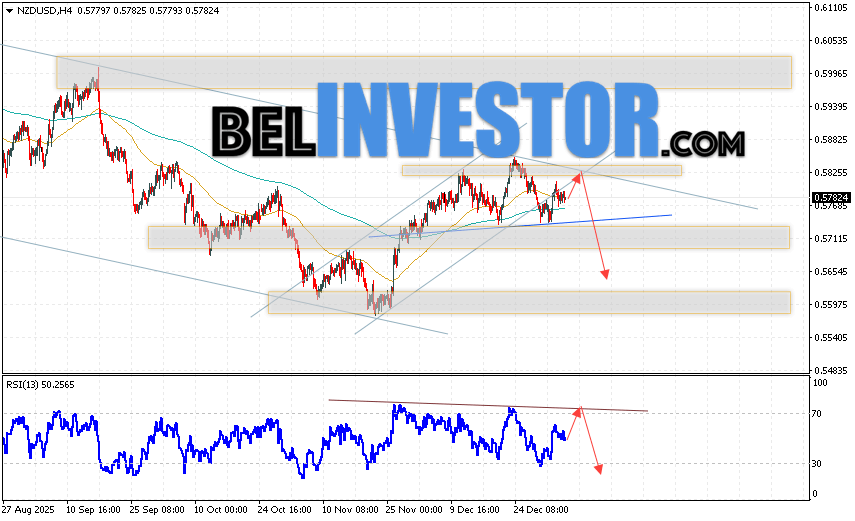 NZD/USD прогноз Форекс и аналитика на 8 января 2026 предполагает попытку теста области сопротивления вблизи уровня 0.5830. Откуда стоит ожидать продолжения падения котировок в область ниже уровня 0.5645. Дополнительным сигналом в пользу снижения выступит отбой от линии сопротивления на индикаторе относительной силы. Отменой варианта падения пары NZD/USD станет сильный рост цены и пробой уровня 0.5915. В этом случае стоит ожидать продолжение роста пары с потенциальной целью выше уровня 0.6165.