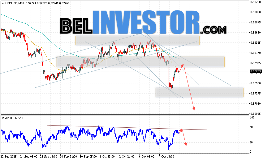 NZD/USD прогноз Форекс и аналитика на 9 октября 2025 предполагает попытку теста области сопротивления вблизи уровня 0.5805. Откуда стоит ожидать продолжения падения котировок в область ниже уровня 0.5665. Дополнительным сигналом в пользу снижения выступит отбой от линии сопротивления на индикаторе относительной силы. Отменой варианта падения пары NZD/USD станет сильный рост цены и пробой уровня 0.5855. В этом случае стоит ожидать продолжение подъёма пары с потенциальной целью выше уровня 0.6195.
