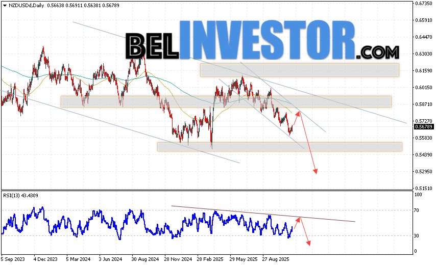 Дополнительным сигналом в пользу падения валютной пары NZD/USD выступит тест линии сопротивления на индикаторе относительной силы (индикатор RSI). Вторым сигналом станет отскок от верхней границы медвежьего канала. Отменой варианта падения котировок пары на текущей торговой неделе 17 — 21 ноября 2025 станет сильный рост и пробой области 0.6045. Это укажет на пробой области сопротивления и продолжение роста пары NZD/USD с потенциальной целью выше уровня 0.6375. Подтверждением падению валютной пары на Форекс выступит пробой области поддержки и закрытие котировок ниже области 0.5545.