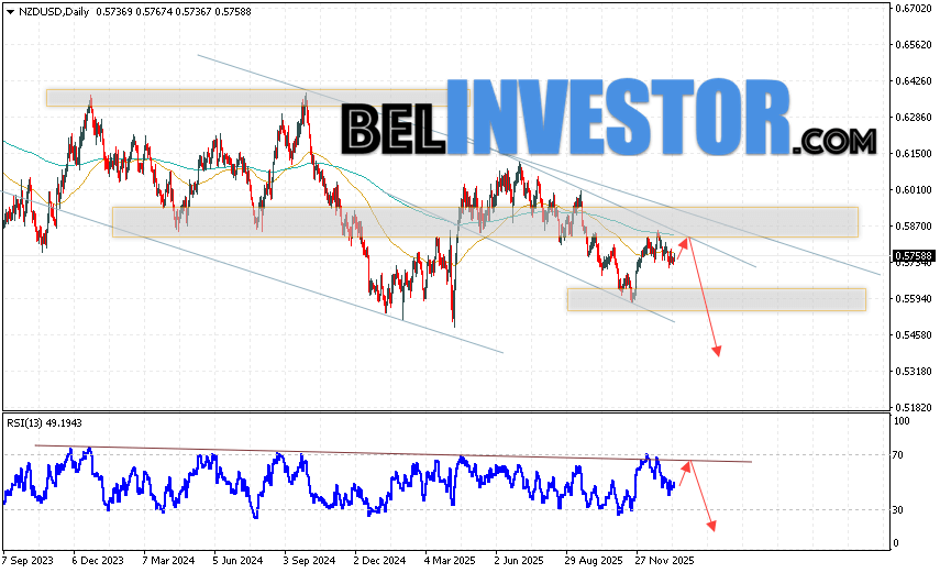 Дополнительным сигналом в пользу падения валютной пары NZD/USD выступит тест линии сопротивления на индикаторе относительной силы (индикатор RSI). Вторым сигналом станет отскок от верхней границы медвежьего канала. Отменой варианта падения котировок пары на текущей торговой неделе 19 — 23 января 2026 станет сильный рост и пробой области 0.6005. Это укажет на пробой области сопротивления и продолжение роста пары NZD/USD с потенциальной целью выше уровня 0.6235. Подтверждением падению валютной пары на Форекс выступит пробой области поддержки и закрытие котировок ниже области 0.5575.