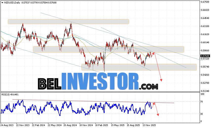 Дополнительным сигналом в пользу падения валютной пары NZD/USD выступит тест линии сопротивления на индикаторе относительной силы (индикатор RSI). Вторым сигналом станет отскок от нижней границы бычьего канала, который был пробит продавцами вниз. Отменой варианта падения котировок пары на текущей торговой неделе 5 — 9 января 2026 станет сильный рост и пробой области 0.6045. Это укажет на пробой области сопротивления и продолжение роста пары NZD/USD с потенциальной целью выше уровня 0.6275. Подтверждением падению валютной пары на Форекс выступит пробой области поддержки и закрытие котировок ниже области 0.5705.
