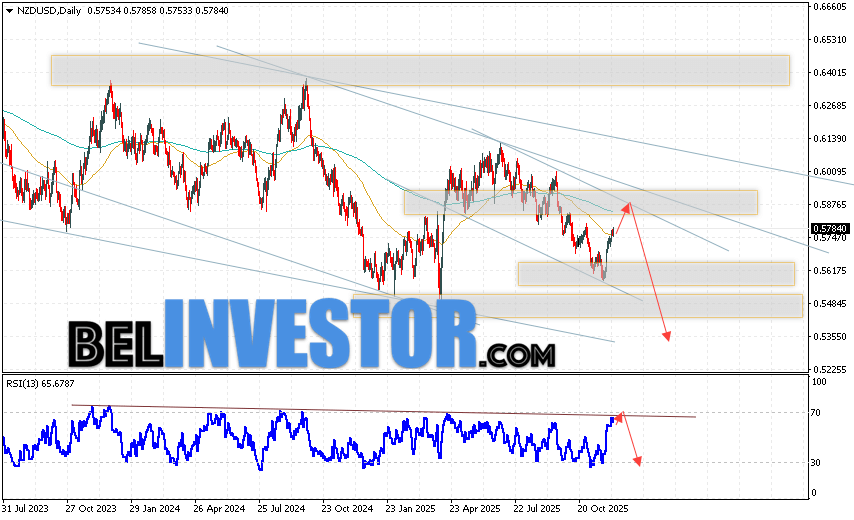 Дополнительным сигналом в пользу падения валютной пары NZD/USD выступит тест линии сопротивления на индикаторе относительной силы (индикатор RSI). Вторым сигналом станет отскок от верхней границы медвежьего канала. Отменой варианта падения котировок пары на текущей торговой неделе 8 — 12 декабря 2025 станет сильный рост и пробой области 0.6065. Это укажет на пробой области сопротивления и продолжение роста пары NZD/USD с потенциальной целью выше уровня 0.6375. Подтверждением падению валютной пары на Форекс выступит пробой области поддержки и закрытие котировок ниже области 0.5485.