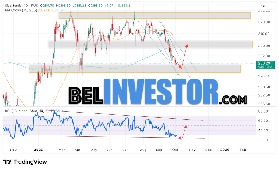 Котировки акций Сбербанк завершили торговую неделю на уровне 286.29. На данный момент акции продолжают движение в рамках падения и нисходящего канала. Скользящие средние сигнализируют о наличии краткосрочной медвежьей тенденции, цены пробили область между сигнальными линиями вниз, что указывает на усиленное давление со стороны медведей. Это может свидетельствовать о возможном продолжении падения котировок Сбербанк уже с текущих уровней. Сбербанк прогноз на неделю 6 — 10 октября 2025 предполагает попытку развития падения, с тестом уровня поддержки в районе 280.05. Если этот уровень устоит под натиском покупателей, можно ожидать отскок вверх, что откроет возможности для продолжения роста курса акций Сбербанк с целью выше уровня 300.05.