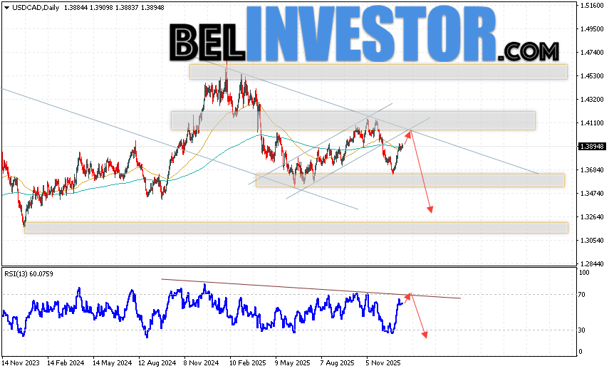 USDCAD прогноз Канадский Доллар на 19 — 23 января 2026 предполагает попытку развития бычьей коррекции и теста области сопротивления вблизи уровня 1.3985. Далее, продолжение падения с целью ниже уровня 1.3265. Дополнительным сигналом в пользу снижения выступит тест линии сопротивления на индикаторе относительной силы. Отменой варианта развития падения станет сильный рост и пробой области 1.4185. Это укажет на пробой важного уровня сопротивления и продолжение подъёма с целью выше 1.4375.