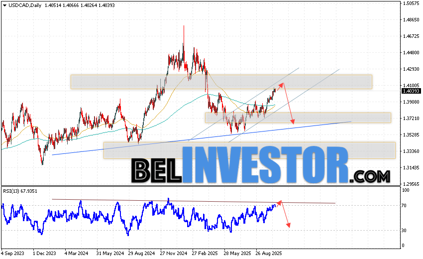 USDCAD прогноз Канадский Доллар на 20 — 24 октября 2025 предполагает попытку развития бычьей коррекции и теста области сопротивления вблизи уровня 1.4105. Далее, продолжение падения с целью ниже уровня 1.3675. Дополнительным сигналом в пользу снижения выступит тест линии тренда на индикаторе относительной силы. Отменой варианта развития падения станет сильный рост и пробой области 1.4285. Это укажет на пробой важного уровня сопротивления и продолжение подъёма с целью выше 1.4665.