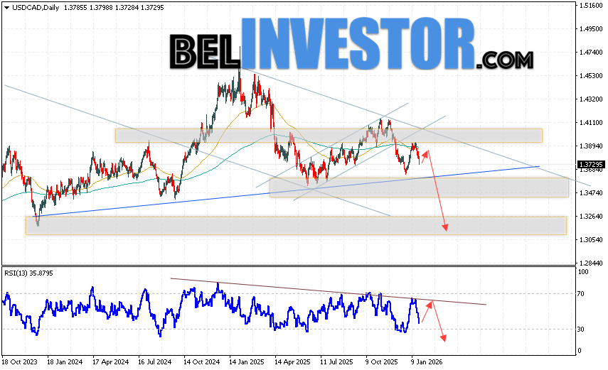 USDCAD прогноз Канадский Доллар на 26 — 30 января 2026 предполагает попытку развития бычьей коррекции и теста области сопротивления вблизи уровня 1.3985. Далее, продолжение падения с целью ниже уровня 1.3265. Дополнительным сигналом в пользу снижения выступит тест линии сопротивления на индикаторе относительной силы. Отменой варианта развития падения станет сильный рост и пробой области 1.4185. Это укажет на пробой важного уровня сопротивления и продолжение подъёма с целью выше 1.4375.