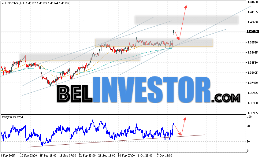 USD/CAD прогноз Канадского Доллара на 10 октября 2025 предполагает попытку теста области поддержки вблизи уровня 1.3965. Далее, продолжение роста в область выше уровня 1.4175. Дополнительным сигналом в пользу подъёма Канадского Доллара на Форекс выступит тест линии поддержки на индикаторе относительной силы. Отменой варианта роста котировок USD/CAD станет падение и пробой уровня 1.3905. Это укажет на продолжение снижения стоимости актива с потенциальной целью ниже уровня 1.3745.