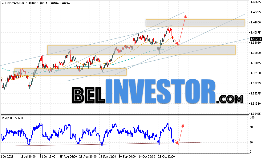 USD/CAD прогноз Канадского Доллара на 11 ноября 2025 предполагает попытку теста области поддержки вблизи уровня 1.3985. Далее, продолжение роста в область выше уровня 1.4235. Дополнительным сигналом в пользу подъёма Канадского Доллара на Форекс выступит тест линии поддержки на индикаторе относительной силы. Отменой варианта роста котировок USD/CAD станет падение и пробой уровня 1.3925. Это укажет на продолжение падения стоимости актива с потенциальной целью ниже уровня 1.3765.