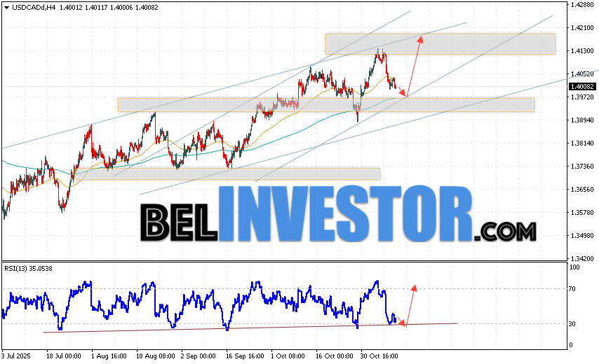 USD/CAD прогноз Канадского Доллара на 13 ноября 2025 предполагает попытку теста области поддержки вблизи уровня 1.3975. Далее, продолжение роста в область выше уровня 1.4165. Дополнительным сигналом в пользу подъёма Канадского Доллара на Форекс выступит тест линии поддержки на индикаторе относительной силы. Отменой варианта роста котировок USD/CAD станет падение и пробой уровня 1.3885. Это укажет на продолжение падения стоимости актива с потенциальной целью ниже уровня 1.3675.