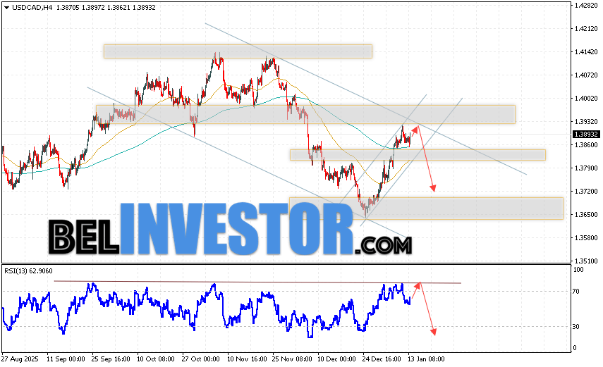 USD/CAD прогноз Канадского Доллара на 14 января 2026 предполагает попытку теста области сопротивления вблизи уровня 1.3915. Далее, продолжение падения в область ниже уровня 1.3720. Дополнительным сигналом в пользу снижения Канадского Доллара на Форекс выступит тест линии сопротивления на индикаторе относительной силы. Отменой варианта падения котировок USD/CAD станет сильный рост и пробой уровня 1.3985. Это укажет на продолжение снижения стоимости актива с потенциальной целью ниже уровня 1.4125.