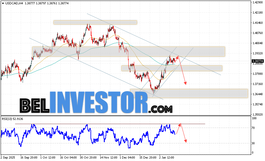 USD/CAD прогноз Канадского Доллара на 15 января 2026 предполагает попытку теста области сопротивления вблизи уровня 1.3905. Далее, продолжение падения в область ниже уровня 1.3715. Дополнительным сигналом в пользу снижения Канадского Доллара на Форекс выступит тест линии сопротивления на индикаторе относительной силы. Отменой варианта падения котировок USD/CAD станет сильный рост и пробой уровня 1.3975. Это укажет на продолжение снижения стоимости актива с потенциальной целью ниже уровня 1.4145.
