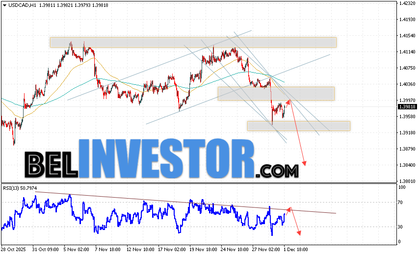 USD/CAD прогноз Канадского Доллара на 2 декабря 2025 предполагает попытку теста области сопротивления вблизи уровня 1.3995. Далее, продолжение падения в область ниже уровня 1.3845. Дополнительным сигналом в пользу снижения Канадского Доллара на Форекс выступит тест линии сопротивления на индикаторе относительной силы. Отменой варианта падения котировок USD/CAD станет сильный рост и пробой уровня 1.4055. Это укажет на продолжение роста стоимости актива с потенциальной целью выше уровня 1.4285.