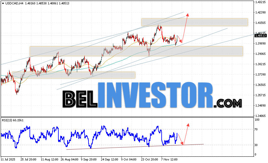 USD/CAD прогноз Канадского Доллара на 20 ноября 2025 предполагает попытку теста области поддержки вблизи уровня 1.3985. Далее, продолжение роста в область выше уровня 1.4235. Дополнительным сигналом в пользу подъёма Канадского Доллара на Форекс выступит тест линии поддержки на индикаторе относительной силы. Отменой варианта роста котировок USD/CAD станет падение и пробой уровня 1.3925. Это укажет на продолжение падения стоимости актива с потенциальной целью ниже уровня 1.3665.