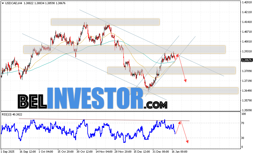 USD/CAD прогноз Канадского Доллара на 20 января 2026 предполагает попытку теста области сопротивления вблизи уровня 1.3905. Далее, продолжение падения в область ниже уровня 1.3705. Дополнительным сигналом в пользу снижения Канадского Доллара на Форекс выступит тест линии сопротивления на индикаторе относительной силы. Отменой варианта падения котировок USD/CAD станет сильный рост и пробой уровня 1.3985. Это укажет на продолжение снижения стоимости актива с потенциальной целью ниже уровня 1.4165.
