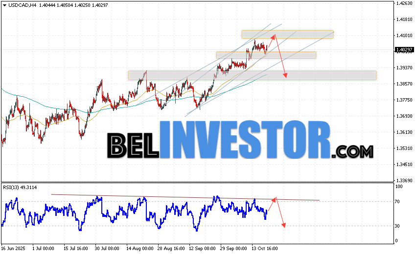 USD/CAD прогноз Канадского Доллара на 21 октября 2025 предполагает попытку теста области сопротивления вблизи уровня 1.4085. Далее, продолжение падения в область ниже уровня 1.3885. Дополнительным сигналом в пользу снижения Канадского Доллара на Форекс выступит тест линии сопротивления на индикаторе относительной силы. Отменой варианта падения котировок USD/CAD станет сильный рост и пробой уровня 1.4165. Это укажет на продолжение подъёма стоимости актива с потенциальной целью выше уровня 1.4345.