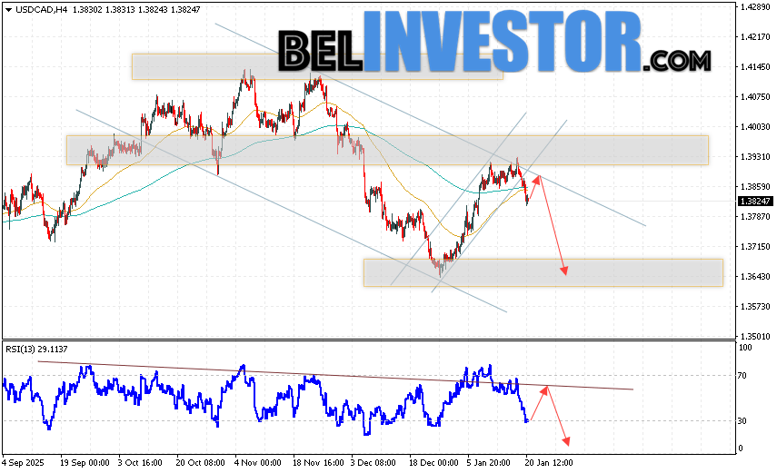 USD/CAD прогноз Канадского Доллара на 21 января 2026 предполагает попытку теста области сопротивления вблизи уровня 1.3865. Далее, продолжение падения в область ниже уровня 1.3645. Дополнительным сигналом в пользу снижения Канадского Доллара на Форекс выступит тест линии сопротивления на индикаторе относительной силы. Отменой варианта падения котировок USD/CAD станет сильный рост и пробой уровня 1.4005. Это укажет на продолжение снижения стоимости актива с потенциальной целью ниже уровня 1.4175.