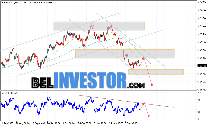 USD/CAD прогноз Канадского Доллара на 23 декабря 2025 предполагает попытку теста области сопротивления вблизи уровня 1.3795. Далее, продолжение падения в область ниже уровня 1.3575. Дополнительным сигналом в пользу снижения Канадского Доллара на Форекс выступит тест линии сопротивления на индикаторе относительной силы. Отменой варианта падения котировок USD/CAD станет сильный рост и пробой уровня 1.3925. Это укажет на продолжение подъёма стоимости актива с потенциальной целью выше уровня 1.4075.