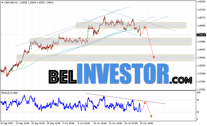 USD/CAD прогноз Канадского Доллара на 23 октября 2025 предполагает попытку теста области сопротивления вблизи уровня 1.4055. Далее, продолжение падения в область ниже уровня 1.3845. Дополнительным сигналом в пользу снижения Канадского Доллара на Форекс выступит тест линии сопротивления на индикаторе относительной силы. Отменой варианта падения котировок USD/CAD станет сильный рост и пробой уровня 1.4115. Это укажет на продолжение подъёма стоимости актива с потенциальной целью выше уровня 1.4365.