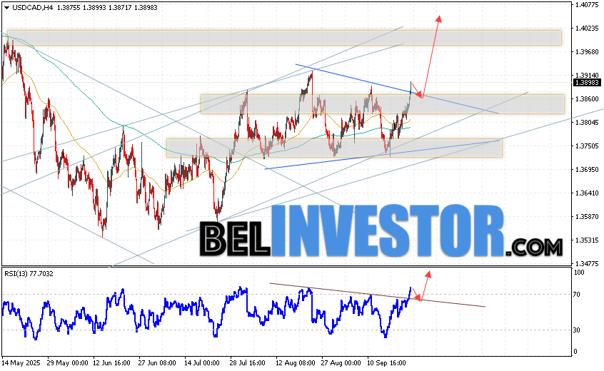 USD/CAD прогноз Канадского Доллара на 25 сентября 2025 предполагает попытку теста области поддержки вблизи уровня 1.3855. Далее, продолжение роста в область выше уровня 1.4055. Дополнительным сигналом в пользу подъёма Канадского Доллара на Форекс выступит тест линии поддержки на индикаторе относительной силы. Отменой варианта роста котировок USD/CAD станет падение и пробой уровня 1.3675. Это укажет на продолжение снижения стоимости актива с потенциальной целью ниже уровня 1.3465.
