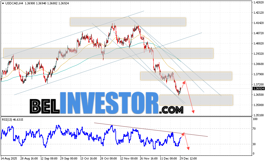 USD/CAD прогноз Канадского Доллара на 30 декабря 2025 предполагает попытку теста области сопротивления вблизи уровня 1.3735. Далее, продолжение падения в область ниже уровня 1.3545. Дополнительным сигналом в пользу снижения Канадского Доллара на Форекс выступит тест линии сопротивления на индикаторе относительной силы. Отменой варианта падения котировок USD/CAD станет сильный рост и пробой уровня 1.3845. Это укажет на продолжение подъёма стоимости актива с потенциальной целью выше уровня 1.3985.
