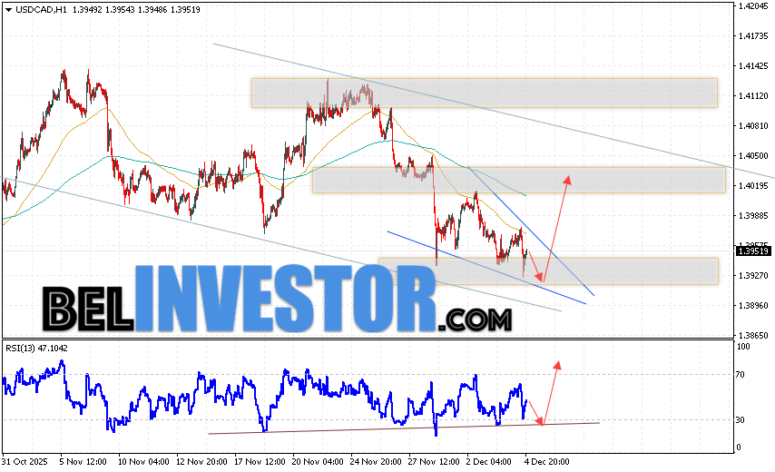 USD/CAD прогноз Канадского Доллара на 5 декабря 2025 предполагает попытку теста области поддержки вблизи уровня 1.3925. Далее, продолжение роста в область выше уровня 1.4035. Дополнительным сигналом в пользу подъёма Канадского Доллара на Форекс выступит тест линии поддержки на индикаторе относительной силы. Отменой варианта роста котировок USD/CAD станет падение и пробой уровня 1.3845. Это укажет на продолжение снижения стоимости актива с потенциальной целью ниже уровня 1.3665.