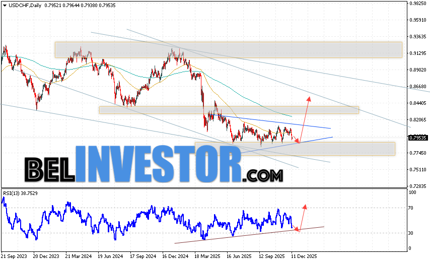 Дополнительным сигналом в пользу роста валютной пары Доллар Франк выступит тест линии поддержки на индикаторе относительной силы (RSI). Вторым сигналом станет отскок от нижней границы модели ”Треугольник”. Отменой варианта подъёма USD/CHF на текущей торговой неделе станет падение котировок и пробой области 0.7675. Это укажет на пробой области поддержки и продолжение падения пары на Форекс с целью ниже области 0.7355. Подтверждением росту пары на текущей торговой неделе 15 — 19 декабря 2025 выступит пробой области сопротивления и закрытие котировок выше уровня 0.8235, что укажет на пробой верхней границы модели ”Треугольник” и начало реализации паттерна с целями вверху.