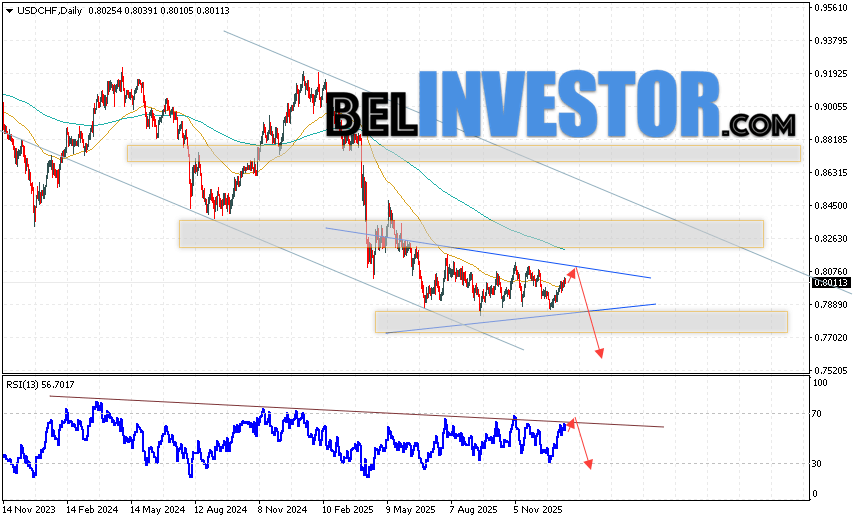 USD/CHF прогноз на неделю 19 — 23 января 2026 предполагает попытку развития бычьей коррекции и тест уровня сопротивления вблизи области 0.7865. Затем, продолжение падения пары USD/CHF в область ниже уровня 0.7565. В пользу падения выступит тест линии тренда на индикаторе относительной силы. Отменой варианта снижения USD/CHF станет пробой области сопротивления и закрытие котировок выше уровня 0.8155. Это укажет на продолжение подъёма пары с потенциальной целью выше уровня 0.8335.
