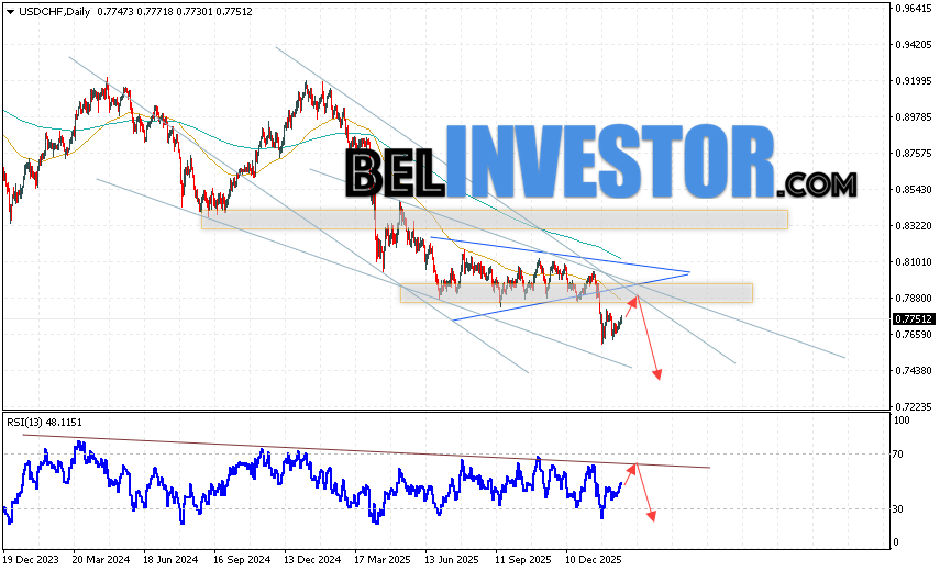 USD/CHF прогноз на неделю 23 — 27 февраля 2026 предполагает попытку развития бычьей коррекции и тест уровня сопротивления вблизи области 0.7815. Затем, продолжение падения пары USD/CHF в область ниже уровня 0.7375. В пользу падения выступит тест линии тренда на индикаторе относительной силы. Отменой варианта снижения USD/CHF станет пробой области сопротивления и закрытие котировок выше уровня 0.8155. Это укажет на продолжение подъёма пары с потенциальной целью выше уровня 0.8475.