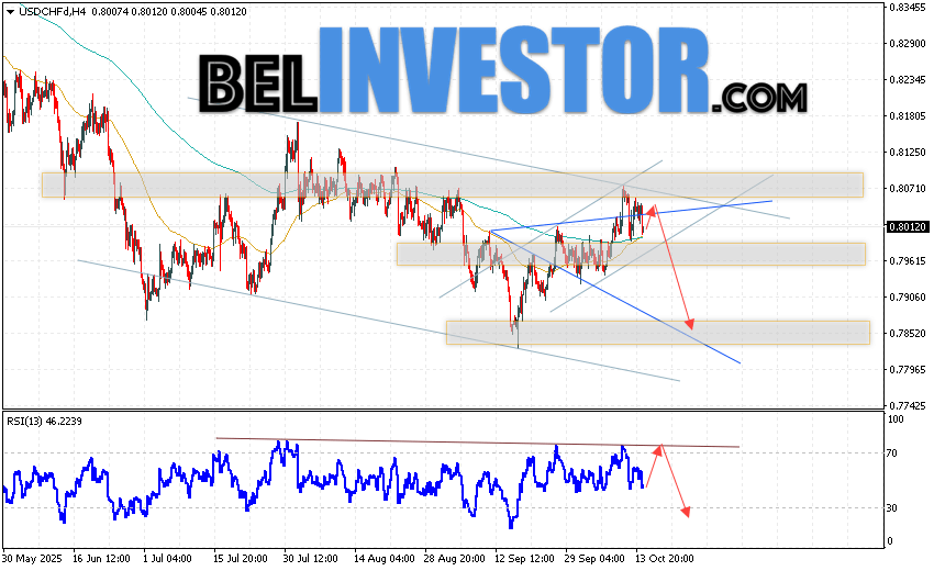 USD/CHF прогноз Швейцарского Франка на 15 октября 2025 предполагает попытку развития бычьей коррекции и теста области сопротивления вблизи уровня 0.8065. Далее, продолжение падения валютной пары USD/CHF с целью ниже уровня 0.7855. Дополнительным сигналом в пользу снижения пары Доллар Франк выступит отскок от линии тренда на индикаторе относительной силы. Отменой варианта падения станет сильный рост и пробой области 0.8135. Это укажет на пробой уровня сопротивления и продолжение подъёма пары с потенциальной целью выше уровня 0.8355.