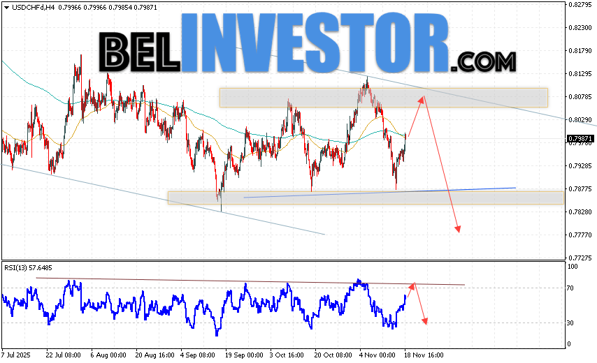 USD/CHF прогноз Швейцарского Франка на 19 ноября 2025 предполагает попытку развития бычьей коррекции и теста области сопротивления вблизи уровня 0.8075. Далее, продолжение падения валютной пары USD/CHF с целью ниже уровня 0.7775. Дополнительным сигналом в пользу падения пары Доллар Франк выступит отскок от линии тренда на индикаторе относительной силы. Отменой варианта падения станет сильный рост и пробой области 0.8155. Это укажет на пробой уровня сопротивления и продолжение роста пары с потенциальной целью выше уровня 0.8315.