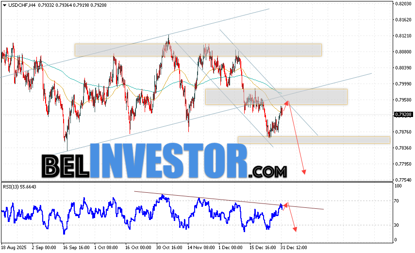 USD/CHF прогноз Швейцарского Франка на 2 января 2026 предполагает попытку развития бычьей коррекции и теста области сопротивления вблизи уровня 0.7945. Далее, продолжение падению валютной пары USD/CHF с целью ниже уровня 0.7765. Дополнительным сигналом в пользу снижения пары Доллар Франк выступит отскок от линии тренда на индикаторе относительной силы. Отменой варианта падения станет сильный рост и пробой области 0.7995. Это укажет на пробой уровня сопротивления и продолжение роста пары с потенциальной целью выше уровня 0.8165.