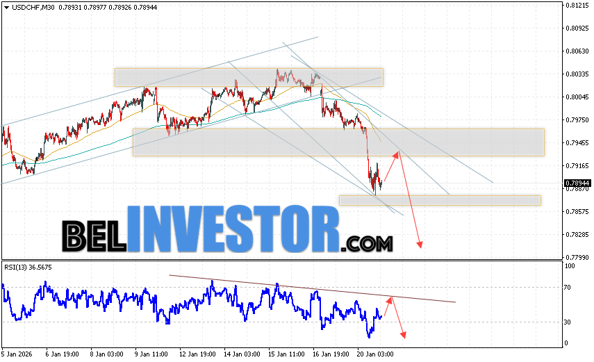 USD/CHF прогноз Швейцарского Франка на 21 января 2026 предполагает попытку развития подъёма и теста области сопротивления вблизи уровня 0.7935. Далее, продолжение падения валютной пары USD/CHF с целью ниже уровня 0.7795. Дополнительным сигналом в пользу снижения пары Доллар Франк выступит отскок от линии тренда на индикаторе относительной силы. Отменой варианта падения станет сильный рост и пробой области 0.8005. Это укажет на пробой уровня сопротивления и продолжение подъёма пары с потенциальной целью выше уровня 0.8145.