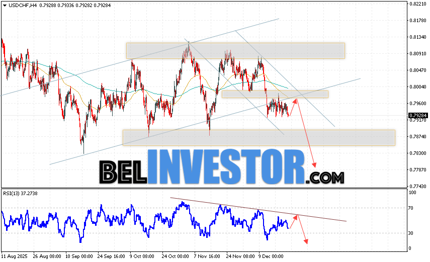 USD/CHF прогноз Швейцарского Франка на 23 декабря 2025 предполагает попытку развития бычьей коррекции и теста области сопротивления вблизи уровня 0.7975. Далее, продолжение падения валютной пары USD/CHF с целью ниже уровня 0.7785. Дополнительным сигналом в пользу снижения пары Доллар Франк выступит отскок от линии тренда на индикаторе относительной силы. Отменой варианта падения станет сильный рост и пробой области 0.8045. Это укажет на пробой уровня сопротивления и продолжение роста пары с потенциальной целью выше уровня 0.8225.