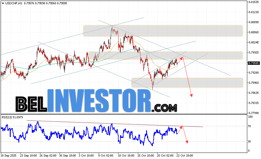 USD/CHF прогноз Швейцарского Франка на 23 октября 2025 предполагает попытку развития бычьей коррекции и теста области сопротивления вблизи уровня 0.7995. Далее, продолжение падения валютной пары USD/CHF с целью ниже уровня 0.7845. Дополнительным сигналом в пользу снижения пары Доллар Франк выступит отскок от линии тренда на индикаторе относительной силы. Отменой варианта падения станет сильный рост и пробой области 0.8045. Это укажет на пробой уровня сопротивления и продолжение подъёма пары с потенциальной целью выше уровня 0.8225.