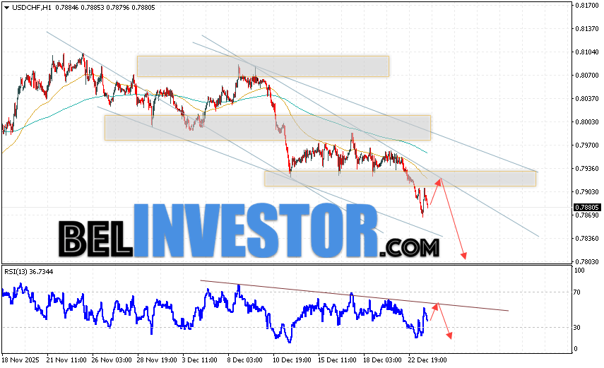 USD/CHF прогноз Швейцарского Франка на 24 декабря 2025 предполагает попытку развития бычьей коррекции и теста области сопротивления вблизи уровня 0.7965. Далее, продолжение падения валютной пары USD/CHF с целью ниже уровня 0.7825. Дополнительным сигналом в пользу снижения пары Доллар Франк выступит отскок от линии тренда на индикаторе относительной силы. Отменой варианта падения станет сильный рост и пробой области 0.8005. Это укажет на пробой уровня сопротивления и продолжение роста пары с потенциальной целью выше уровня 0.8175.