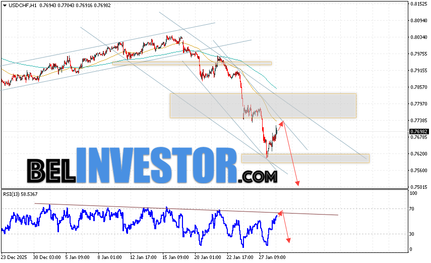 USD/CHF прогноз Швейцарского Франка на 29 января 2026 предполагает попытку развития подъёма и теста области сопротивления вблизи уровня 0.7735. Далее, продолжение падения валютной пары USD/CHF с целью ниже уровня 0.7535. Дополнительным сигналом в пользу снижения пары Доллар Франк выступит отскок от линии тренда на индикаторе относительной силы. Отменой варианта падения станет сильный рост и пробой области 0.7805. Это укажет на пробой уровня сопротивления и продолжение подъёма пары с потенциальной целью выше уровня 0.7985.