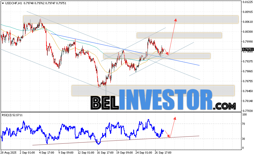 USD/CHF прогноз Швейцарского Франка на 30 сентября 2025 предполагает попытку развития медвежьей коррекции и теста области поддержки вблизи уровня 0.7945. Далее, продолжение роста валютной пары USD/CHF с целью выше уровня 0.8065. Дополнительным сигналом в пользу подъёма пары Доллар Франк выступит отскок от линии тренда на индикаторе относительной силы. Отменой варианта роста станет падение и пробой области 0.7875. Это укажет на пробой уровня поддержки и продолжение падения пары с потенциальной целью ниже уровня 0.7675.