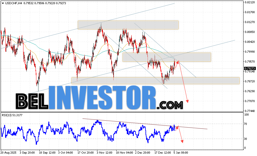USD/CHF прогноз Швейцарского Франка на 6 января 2026 предполагает попытку развития бычьей коррекции и теста области сопротивления вблизи уровня 0.7955. Далее, продолжение падению валютной пары USD/CHF с целью ниже уровня 0.7785. Дополнительным сигналом в пользу снижения пары Доллар Франк выступит отскок от линии тренда на индикаторе относительной силы. Отменой варианта падения станет сильный рост и пробой области 0.7995. Это укажет на пробой уровня сопротивления и продолжение роста пары с потенциальной целью выше уровня 0.8175.