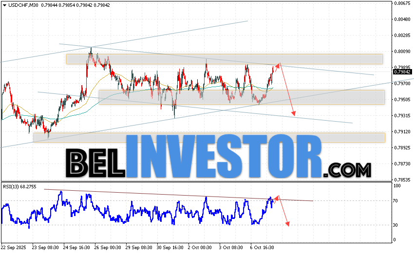 USD/CHF прогноз Швейцарского Франка на 8 октября 2025 предполагает попытку развития бычьей коррекции и теста области сопротивления вблизи уровня 0.7990. Далее, продолжение падения валютной пары USD/CHF с целью ниже уровня 0.7930. Дополнительным сигналом в пользу снижения пары Доллар Франк выступит отскок от линии тренда на индикаторе относительной силы. Отменой варианта падения станет сильный рост и пробой области 0.8025. Это укажет на пробой уровня сопротивления и продолжение подъёма пары с потенциальной целью выше уровня 0.8235.