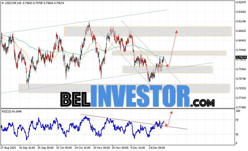 USD/CHF прогноз Швейцарского Франка на 8 января 2026 предполагает попытку развития снижения и теста области поддержки вблизи уровня 0.7920. Далее, продолжение роста валютной пары USD/CHF с целью выше уровня 0.8085. Дополнительным сигналом в пользу подъёма пары Доллар Франк выступит отскок от линии тренда на индикаторе относительной силы. Отменой варианта роста станет падение и пробой области 0.7865. Это укажет на пробой уровня поддержки и продолжение падения пары с потенциальной целью ниже уровня 0.7635.