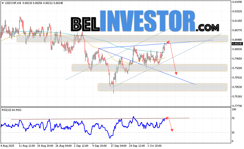 USD/CHF прогноз Швейцарского Франка на 9 октября 2025 предполагает попытку развития бычьей коррекции и теста области сопротивления вблизи уровня 0.8035. Далее, продолжение падения валютной пары USD/CHF с целью ниже уровня 0.7905. Дополнительным сигналом в пользу снижения пары Доллар Франк выступит отскок от линии тренда на индикаторе относительной силы. Отменой варианта падения станет сильный рост и пробой области 0.8075. Это укажет на пробой уровня сопротивления и продолжение подъёма пары с потенциальной целью выше уровня 0.8305.