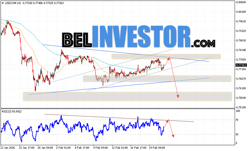 USD/CHF прогноз Швейцарского Франка на 24 февраля 2026 предполагает попытку развития бычьей коррекции и теста области сопротивления вблизи уровня 0.7765. Далее, продолжение падения валютной пары USD/CHF с целью ниже уровня 0.7565. Дополнительным сигналом в пользу снижения пары Доллар Франк выступит отскок от линии тренда на индикаторе относительной силы. Отменой варианта падения станет сильный рост и пробой области 0.7835. Это укажет на пробой уровня сопротивления и продолжение роста пары с потенциальной целью выше уровня 0.7945.