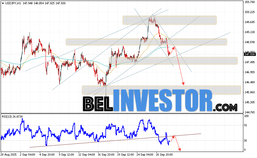 USD/JPY прогноз Японской Иены на 1 октября 2025 предполагает попытку развития бычьей коррекции с тестом зоны сопротивления вблизи уровня 148.35. Затем, продолжение развития медвежьего импульса котировок в область ниже отметки 146.45. В пользу падения пары выступит тест линии тренда на индикаторе относительной силы. Отменой варианта снижения станет сильный рост котировок и пробой области 149.15. Это укажет на пробой уровня сопротивления и продолжение подъёма пары с потенциальной целью выше уровня 150.45.