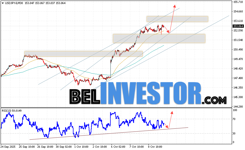 Котировки валютной пары Доллар Иена USD/JPY продолжают движение в рамках развития роста и бычьего канала. В момент публикации прогноза курс Доллара США к Японской Иене составляет 153.06. Скользящие средние указывают на наличие краткосрочной бычьей тенденции по паре. Цены пробили область сигнальными линиями вверх, что указывает на давление со стороны покупателей Доллара США и потенциальное продолжение роста цен уже с текущих уровней. В рамках прогноза курса Японской Иены на 10 октября 2025 стоит ожидать попытку развития снижения котировок и тест области поддержки вблизи уровня 152.35. Далее, отскок цены вверх и продолжение роста пары USD/JPY в область выше уровня 155.45.